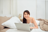 Azjatka pracuje online z laptopem na łóżku dla nowego normalnego życia w okresie kwarantanny z covid-19