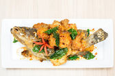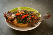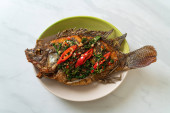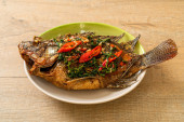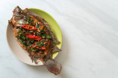 Smażona Tilapia Ryby z sosem czosnkowym Basil chili na wierzchu - domowe jedzenie