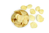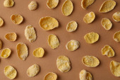 Chipsy ziemniaczane na niebieskim tle, widok z góry