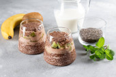 Budyń z nasion szałwii z czekoladą na szarym tle betonu. Zdrowa żywność.