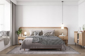 Zdjęcie "Sypialnia wnętrz Mockup ścienny - Rendering 3d, Ilustracja 3d" może być wykorzystywane do celów osobistych i komercyjnych zgodnie z warunkami zakupionej licencji Royalty-free. Obraz jest dostępny do pobrania w jakości wysokiej rozdzielczości do 5760x3840.