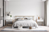 Zdjęcie "Sypialnia wnętrz Mockup ścienny - Rendering 3d, Ilustracja 3d" może być wykorzystywane do celów osobistych i komercyjnych zgodnie z warunkami zakupionej licencji Royalty-free. Obraz jest dostępny do pobrania w jakości wysokiej rozdzielczości do 5760x3840.