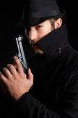 prywatny detektyw biorący kino rezygnować pewien mały aparat fotograficzny, klocki w studio na niebieskim tle z żółte światło i dym