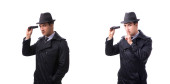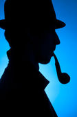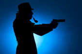 prywatny detektyw biorący kino rezygnować pewien mały aparat fotograficzny, klocki w studio na niebieskim tle z żółte światło i dym