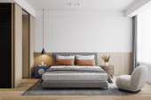 Zdjęcie "Sypialnia wnętrz Mockup ścienny - Rendering 3d, Ilustracja 3d" może być wykorzystywane do celów osobistych i komercyjnych zgodnie z warunkami zakupionej licencji Royalty-free. Obraz jest dostępny do pobrania w jakości wysokiej rozdzielczości do 5760x3840.