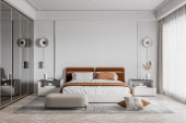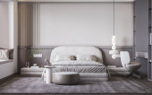 Zdjęcie "Sypialnia wnętrz Mockup ścienny - Rendering 3d, Ilustracja 3d" może być wykorzystywane do celów osobistych i komercyjnych zgodnie z warunkami zakupionej licencji Royalty-free. Obraz jest dostępny do pobrania w jakości wysokiej rozdzielczości do 5760x3840.