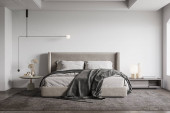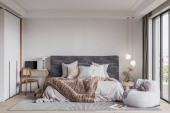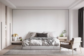 Zdjęcie "Sypialnia wnętrz Mockup ścienny - Rendering 3d, Ilustracja 3d" może być wykorzystywane do celów osobistych i komercyjnych zgodnie z warunkami zakupionej licencji Royalty-free. Obraz jest dostępny do pobrania w jakości wysokiej rozdzielczości do 5760x3840.