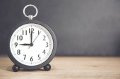 Budzik zabytkowy na drewnianym tle stołu i skopiować miejsce na tekst. Aktywność, codzienna rutyna, poranek, trening i koncepcja równowagi między życiem zawodowym