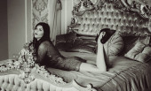 Wspaniały i seksowny piękny model mody na starym lux pokój gościnny w odcieniach niebieskich. Piękna kobieta w stylu vintage i retro wygląd. Elegancki styl w nowoczesnym życiu
