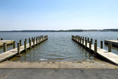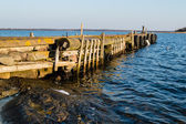 Mały drewniany pomost molo w Fyn Funen Dania atrakcyjne miejsce wypoczynku turystycznego