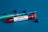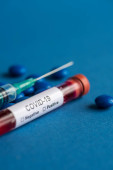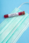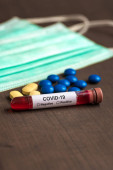 Rurka zawierająca próbkę krwi do badania na obecność koronawirusu / COVID-19 z maską i tabletką leku.