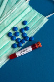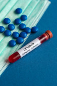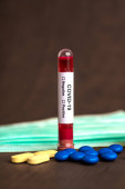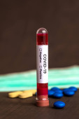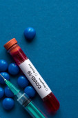 Tabletki ze strzykawką lub wstrzyknięciem i probówka zawierająca próbkę krwi do badania na obecność koronawirusu / COVID-19.