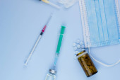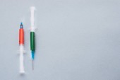 Tabletka medyczna, termometr, butelka i strzykawka lub wstrzyknięcie z probówką zawierającą próbkę krwi do badania na obecność koronawirusu / COVID-19
