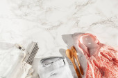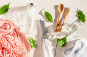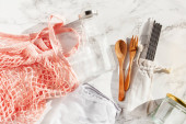zero odpadów ekologiczna koncepcja. Worek bawełniany wielokrotnego użytku, staw do picia ze stali nierdzewnej, słoik szklany, sztućce drewniane