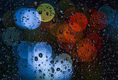Cząsteczka koronawirusu na mokrym niebieskim oknie z kroplami deszczu koncepcja autoizolacji zdjęć. Covid - 19 koncepcja wykończenia.