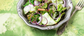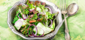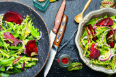 Świeże zdrowe dmuchawce, sałatki z sorrelu i buraków cukrowych.