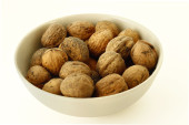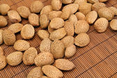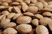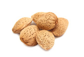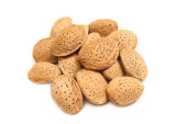 smaczne orzechy migdałów w w wiklinowe miska na białym tle