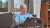 Azjatyccy starsi mężczyźni używają tabletów w domu. Asian Senior Chiński mężczyzna wyszukiwania informacji o tym, jak dobre zdrowie w Internecie leżąc na kanapie w salonie koncepcja domu.