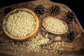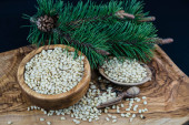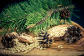 Szyszki cedrowe i orzechy na drewnie oliwnym