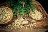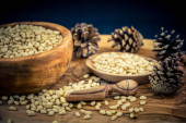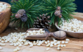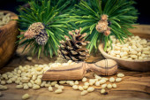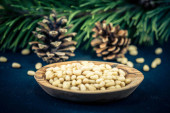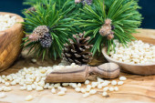 Szyszki cedrowe i orzechy na drewnie oliwnym