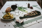 Typowa portugalska potrawa z jagnięciny z ziemniakiem i pieczywem tostowym.