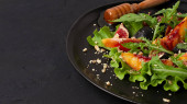 Sałatka, liście rukoli, z Parma prosciutto, wiśnia, przepiórcze jaja, zdrowe jedzenie, widok z góry, poziome, bez ludzi,