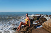 Młoda kobieta odpoczywa siedząc na kamieniu nad oceanem w bikini.
