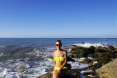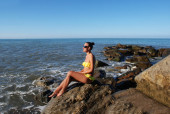 Młoda modna kobieta odpoczywająca na plaży rajskiej wyspy.