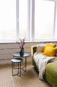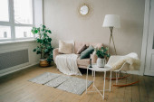 Nowoczesna willa wiejska w stylu skandynawskim, szare minimalistyczne wnętrze z kominkiem i białą ścianą ze sztukaterii. Widok na salon z góry, z drugiego piętra