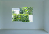 Pusty pokój ze szklanym oknem wnętrze domu na betonowej ścianie