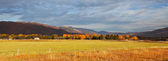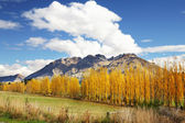 Jesienny krajobraz na Wyspie Południowej Nowej Zelandii koło Arrowtown. Drzewa z kolorowych liści jesieni przed Remarkables, pasmo górskie