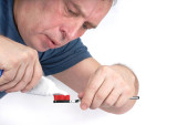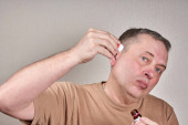 Mężczyzna wlewa lekarstwo do ucha małą pipetą z apteki.