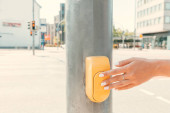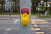 Żółty przycisk na światłach dla pieszych na tle drogi z samochodami