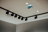 Zdjęcie "Nowoczesne oświetlenie LED w kształcie rury, pokryte czarną matową farbą, zawieszone na suficie." może być wykorzystywane do celów osobistych i komercyjnych zgodnie z warunkami zakupionej licencji Royalty-free. Obraz jest dostępny do pobrania w jakości wysokiej rozdzielczości do 5760x3840.