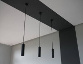Nowoczesne oświetlenie LED w kształcie rury, pokryte czarną matową farbą, zawieszone na suficie.