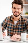 Zdjęcie "człowiek siedzi w swoim miejscu pracy" może być wykorzystywane do celów osobistych i komercyjnych zgodnie z warunkami zakupionej licencji Royalty-free. Obraz jest dostępny do pobrania w jakości wysokiej rozdzielczości do 5760x3840.