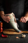 Szef kuchni czyści grubą rybę karpia. Środowisko pracy w kuchni restauracyjnej. Koncepcja żywienia ryb.