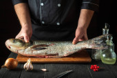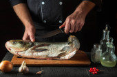 Zdjęcie "Szef kuchni czyści grubą rybę karpia. Środowisko pracy w kuchni restauracyjnej. Koncepcja żywienia ryb." może być wykorzystywane do celów osobistych i komercyjnych zgodnie z warunkami zakupionej licencji Royalty-free. Obraz jest dostępny do pobrania w jakości wysokiej rozdzielczości do 5760x3840.