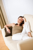 młoda kobieta szczęśliwa relaks, leżenie na kanapie