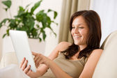 uśmiechnięta kobieta siedząca z laptopem na kanapie