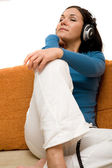 kobieta trzyma odtwarzacz muzyki słucha ze smyczą, leżenie na kanapie w domu