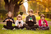 Zdjęcie "Grupa uzależnionych od smartfonów dzieci oglądających razem film animowany na tablecie cyfrowym. Dzieci bawiące się razem telefonem" może być wykorzystywane do celów osobistych i komercyjnych zgodnie z warunkami zakupionej licencji Royalty-free. Obraz jest dostępny do pobrania w jakości wysokiej rozdzielczości do 5760x3840.