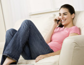na telefon: młoda kobieta w salonie, leżenie na kanapie