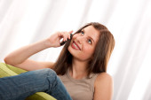 na telefon do domu: szczęśliwa kobieta nazywając, roślin w tle