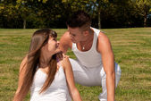 młody mężczyzna i kobieta w wiosna łąka na słoneczny dzień