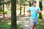 młody człowiek z słuchawki jogging w łące, płytkie dof