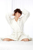 młoda kobieta w biały szlafrok z kawy w salonie