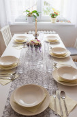 niebieski i biały talerz ustawienie na drewnianym stole w nowoczesnym domu.