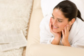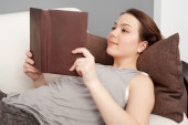 młoda kobieta, poczytać książkę na kanapie na sobie szlafrok