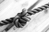 Zniszczone lekkie betonowe płyty, zawiązane grubą żółtą liną, kabel. Koncepcja budowy i wymiany.
